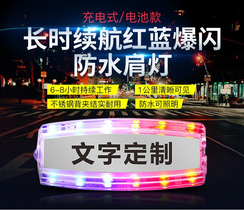 安全防護肩燈主要用于公路交通工作人員,道路環(huán)衛(wèi)工人以及行人夜間道路安全警示,通過多模式,高警示,自主LED發(fā)光提醒過往司機亮燈處有人員存在,小心駕駛,從而達到保護佩戴者的功能。曾經(jīng)有新聞報道,小小的肩燈給一個在火災(zāi)中的生命帶來生存的希望,如果沒有這個肩燈,那消防救助員就不容易發(fā)現(xiàn)他。相信小小的肩燈會實現(xiàn)越來越多,越來越大的功能,可以說肩燈在某些環(huán)境是保命的法寶。公司所生產(chǎn)的充電肩燈和電池肩燈都是通過LED自主多模式發(fā)光,實現(xiàn)爆閃,流水閃,頻閃等高警示閃光,起到非常好的警示效果。